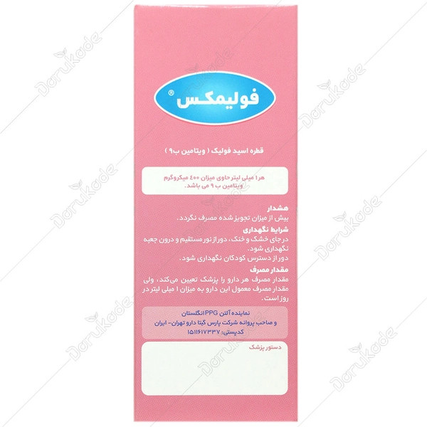 فولیمکس قطره حاوی فولیک اسید، تحت امتیاز و لیسانس شرکت آلتن PPG انگلستان است و با پروانه شرکت پارس گیتا دارو در ایران تولید میشود. قطره فولیمکس جهت تامین ویتامین B9 روزانه بدن، پیشگیری از کم خونی و بهبود علائم تالاسمی مینور کاربرد دارد. همچنین، این محصول مناسب برای دوران قبل از بارداری، حین بارداری و شیردهی است. هر میلی لیتر از folimax حاوی 400 میکروگرم فولیک اسید است و این مکمل در سایز 30 میلی لیتری همراه با قطره چکان به بازار عرضه میگردد. قطره فولیمکس فاقد پارابن، الکل، تخم مرغ، گلوتن و رنگ مصنوعی است. فولیمکس به علت داشتن فرم دارویی قطره، انتخاب مناسبی برای افرادی است که مشکل بلع دارند.