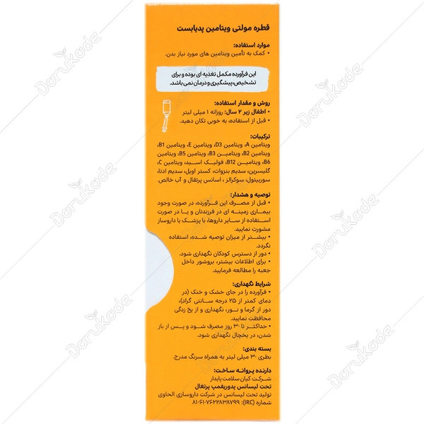 قطره مولتی ویتامین پدیابست در بطری شیشهای 30 میلیلیتری، با طعم دلپذیر پرتقالی و با سرنگ مدرج برای استفاده راحت تر برای نوزادان توسط دارنده پروانه ساخت شرکت کیان سلامت پایدار در کارخانه داروسازی الحاوی تولید و عرضه میشود.