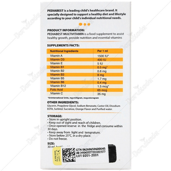 مولتی ویتامین پدیابست یک قطره مولتی ویتامین از برند بسیار محبوب و معتبر پدیا بست برای کودکان زیر 2 سال و نوزادان است. مولتی ویتامین پدیابست دارای ویتامینهای محلول در چربی مانند ویتامین A، ویتامین D، ویتامین E و ویتامینهای محلول در آب از جمله ویتامین ب کمپلکس و ویتامین سی میباشد.