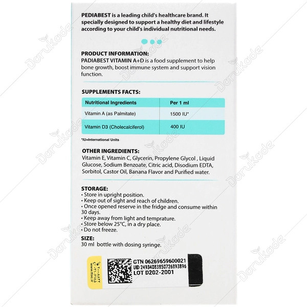 قطره آ د پدیابست تامین کننده 1500 واحد ویتامین A به ازای هر 1 میلی لیتر است.