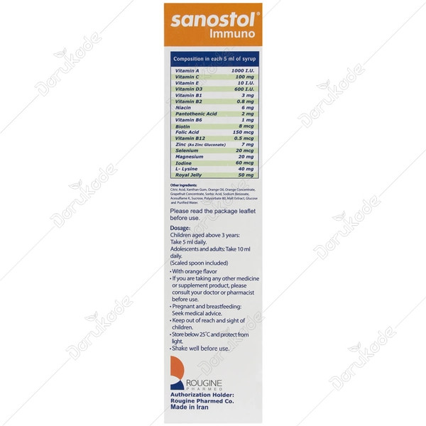 سانستول ایمونو یک مکمل تخصصی جهت تقویت سیستم ایمنی است که علاوه بر انواع ویتامینها و مینرالهای روی، سلنیوم، منیزیم و ید، حاوی اسیدآمینه اللیزین و رویالژلی است. شربت سانستول ایمونو بهنحوی طراحی شده است که با بهبود عملکرد سیستم ایمنی بدن، میتواند در کاهش ابتلا به بیماریهای عفونی، ویروسی و باکتریایی از جمله سرماخوردگی و آنفولانزا و همچنین کاهش شدت و مدت بیماری مفید باشد. سانستول ایمونو بهشکل شربت با طعم پرتقال در بطریهای شیشهای 155 میلیلیتری عرضه میشود. شرکت روژین فارمد صاحب امتیاز و دارنده پروانه ساخت برند sanostol در ایران و منطقه است.