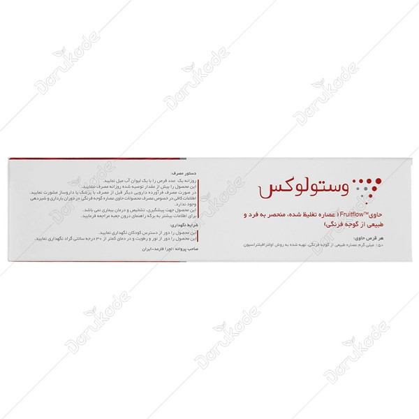 وستولوکس یک فرآورده حاوی 150 میلی گرم Fruitflow عصاره طبیعی از گوجه فرنگی است. این عصاره خاص (Fruitflow) از گوجه فرنگی تازه تهیه می شود که نباید آن را با لیکوپن اشتباه گرفت. این عصاره ویژه با روش اولترافیلتراسیون به دست می آید و حاوی اجزای طبیعی خاصی از گوجه فرنگی است. این عصاره به طور علمی توسط EFSA تایید شده است و علاوه بر اثر آنتی اکسیدانی اثر ویژه حفظ سلامت قلب و عروق را به همراه دارد.