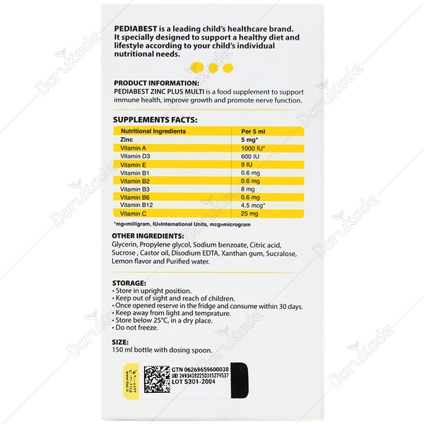 در هر 5 میلی لیتر از شربت زینک پلاس پدیابست، 1000 واحد ویتامین A وجود دارد.