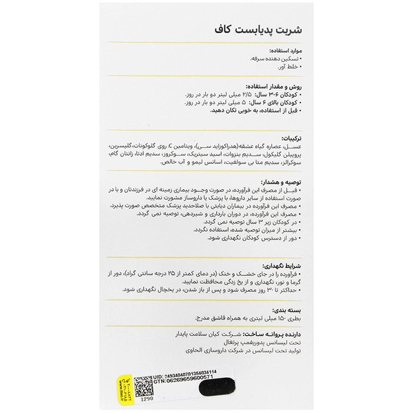 پدیابست کاف به عنوان شربت ضد سرفه کودکان، حاوی 35 میلی گرم عصاره گیاه عشقه در هر 5 میلی لیتر است.