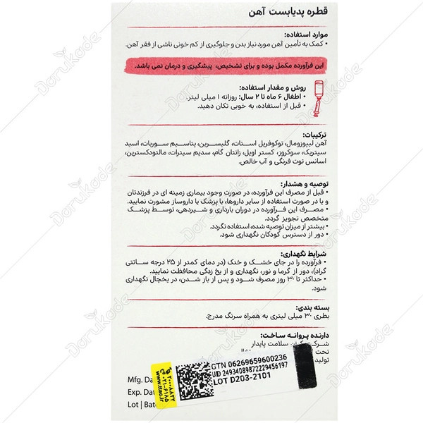 میزان مصرف قطره اهن پدیا بست به صورت روزانه 1 میلیلیتر در کودکان از 6 ماهگی تا 2 سالگی است.