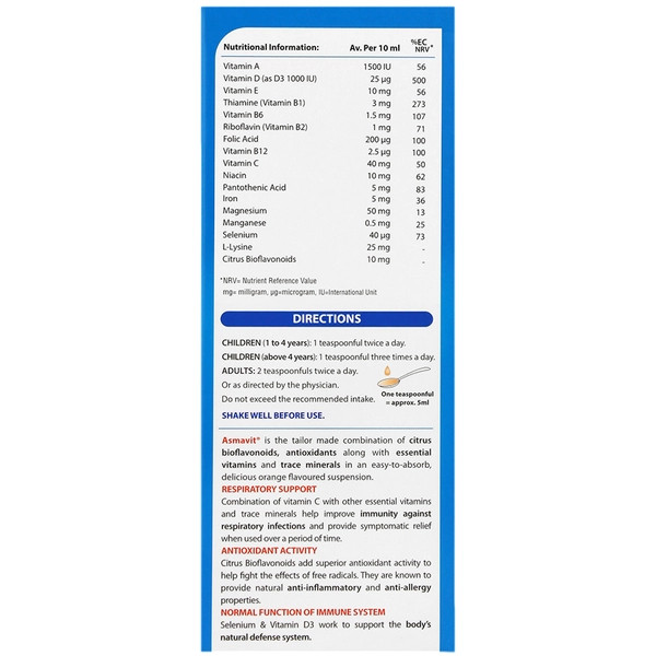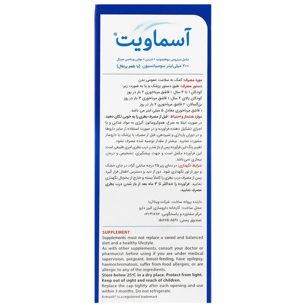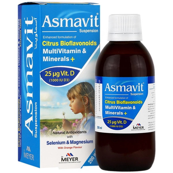 شربت Asmavit مکملی ویتامینی است که حاوی طیف گستردهای از ویتامین ها و املاح مورد نیاز می باشد. اگرچه این فرآورده به طور تخصصی برای کودکان طراحی شده است، اما با مصرف مقادیر بالاتر برای بزرگسالان نیزی قابل استفاده است.