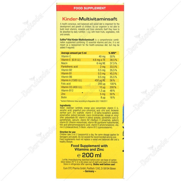 پانتوتنیک اسید، بیوتین و نیاسین در فرآیند تولید انرژی از درشت مغذیها دخیل هستند. وجود عنصر معدنی زینک (روی) در فرمولاسیون شربت کیندر یورو ویتال برای سنتز DNA ضروری بوده و به تقویت عملکرد شناختی مغز، تقویت سیستم ایمنی و حفظ سلامت پوست، مو و ناخن کمک مینماید. شربت کیندر مولتی ویتامین یورو ویتال حاوی 400 واحد ویتامین D3 در هر 5 میلی لیتر است که به حفظ سلامت و رشد و تکامل استخوانها در کودکان کمک مینماید.