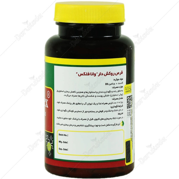 قرص وانافلکس، مکملی حاوی کلسیم کربنات و کوله کلسیفرول است. این مکمل به واسطه دوز نسبتا بالای کلسیم در هر قرص، میتواند در مینرالیزاسیون استخوانها و سلامت دندانها اثربخش باشد. همچنین Vanaflex در کاهش خطر بیماریهای مرتبط با استخوان مانند استئوپروز یا پوکی استخوان کمک کننده خواهد بود.