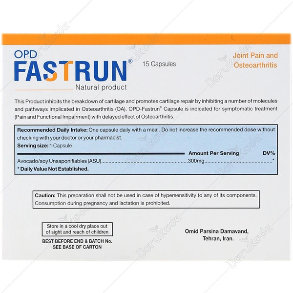 در مطالعات مختلف دیده شده است که عصاره آووکادو و سویا به کاهش تولید فاکتورهای التهابی و تحریک ساخت کلاژن و بازسازی غضروف و مفاصل کمک میکند. بعضی مطالعات بالینی نیز اثرات مثبت ترکیبات فست ران را بر کاهش درد و بهبود عملکرد فیزیکی مفاصل نشان داده است. فست ران به ازای هر قرص حاوی 300 میلی گرم عصاره آووکادو و سویا است. با توجه به مطالب گفته شده مصرف fastrun می تواند در کاهش علائم آرتروز موثر واقع شود.