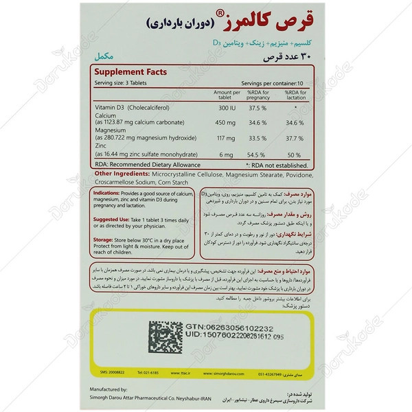 کالمرز بارداری با نام کامل قرص کالمرز در بارداری، در بستههای 30 عددی حاوی 3 بلیستر 10 تایی توسط شرکت داروسازی سیمرغ داروی عطار ایران تولید شده است.