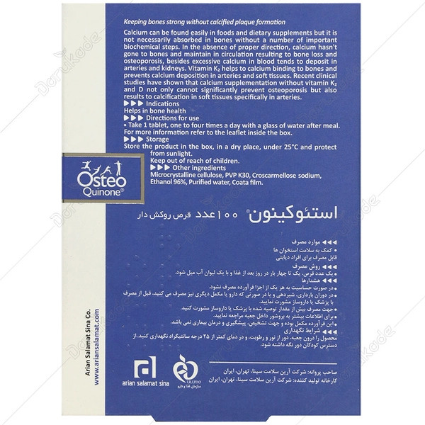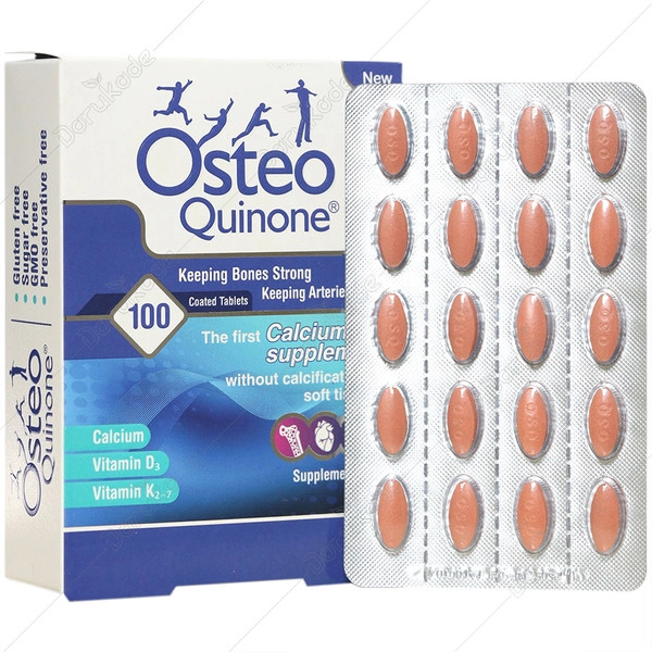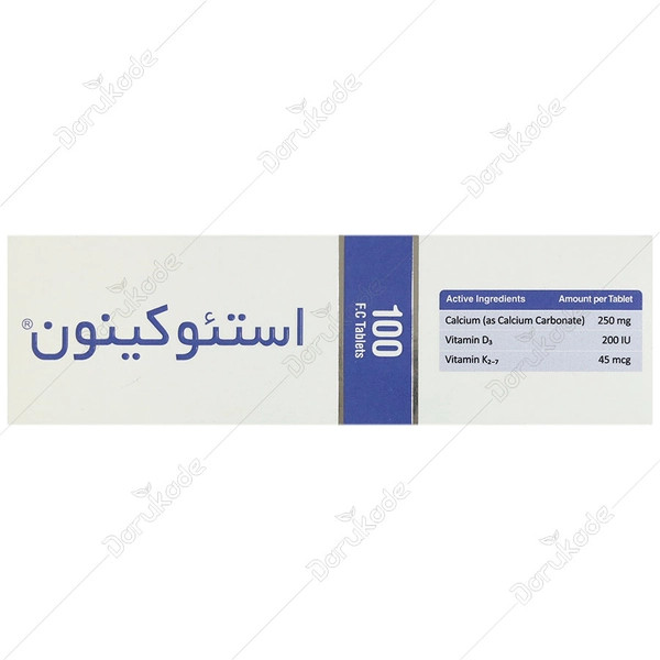 استئوکینون یک مکمل غذایی بدون گلوتن، شکر، تراریخته و نگهدارنده است که برای حفظ سلامت استخوانها و پیشگیری از پوکی استخوان تولید میشود. ترکیبات قرص استئوکینون شامل سه ماده مهم شامل کلسیم (به شکل کربنات کلسیم 250 میلیگرم)، ویتامین D3 (کولهکلسیفرول 200 واحد بینالمللی) و ویتامین K2-7 (به مقدار 45 میکروگرم) است که بهعنوان بخشی از برنامه تغذیهای یا درمانی برای حمایت از سلامت استخوان در گروههای مختلف سنی و شرایط خاص مورد استفاده قرار میگیرد.