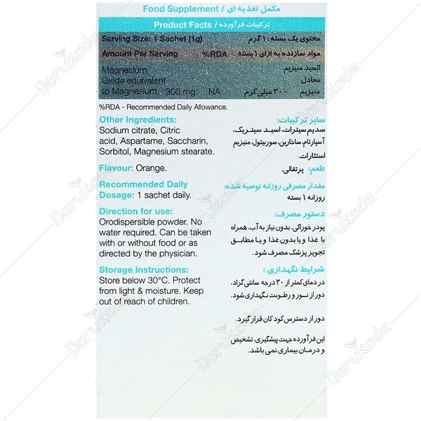 ساشه مگترا یک مکمل تغذیهای حاوی پودر منیزیم اکساید حل شونده در دهان با طعم پرتقال است. ساشه مگترا به منظور کمک به سلامت سیستم عضلانی و سیستم عصبی فرموله شده است.