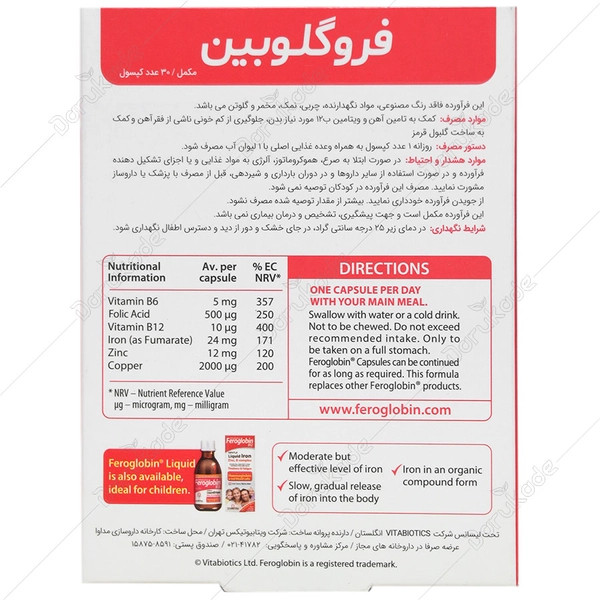 کپسول فروگلوبین تحت لیسانس ویتابیوتیکس انگلستان در کارخانه داروسازی مداوا تولید و در بسته های 30 عددی عرضه شده است.