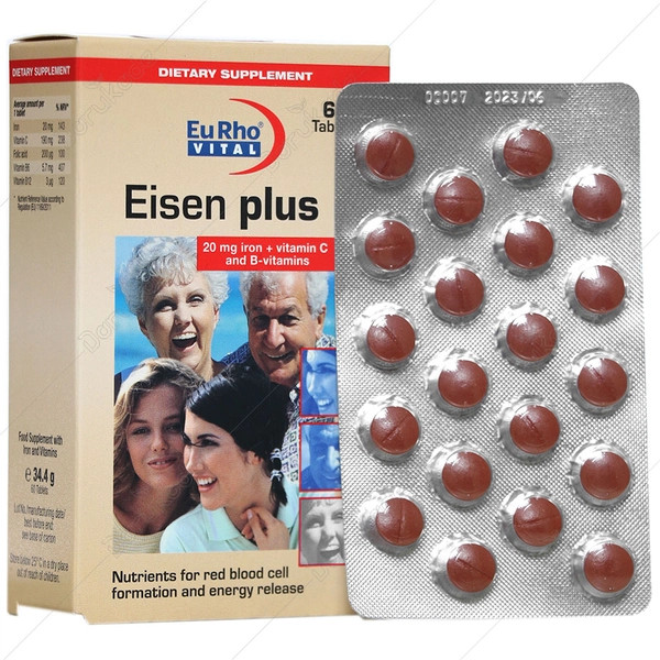 قرص Eisen plus یک مکمل آهن با ترکیبی متعادل از آهن به فرم فومارات، فولیک اسید، ویتامین C، ویتامین B6 وB12 می باشد. هر یک قرص آیزن پلاس یوروویتال حاوی 20 میلی گرم آهن المنتال (آهن قابل جذب از دستگاه گوارش) می باشد. این مکمل با فراهم نمودن آهن مورد نیاز بدن در کنار ویتامین های ضروری برای ساخت گلبول های قرمز خون، فرآیند خونسازی را در بدن تقویت می کند. آیزن پلاس با کم خونی ناشی از فقر آهن و یا کمبود فولیک اسید مقابله می کند، اکسیژن رسانی به بافت ها را تقویت می کند و به عملکرد نرمال سیستم ایمنی و سیستم عصبی کمک می کند. قرص ایزن پلاس علائم ناشی از کمبود آهن از جمله رنگ پریدگی، احساس خستگی و ضعف، سرد شدن دست و پاها، گزگز اندام ها و شکننده شدن ناخن ها را برطرف می کند. قرص آهن ایزن پلاس برای افرادی که در معرض کمبود آهن هستند، علی الخصوص خانم ها در دوران قاعدگی و همچنین افراد گیاه خوار مناسب می باشد. آیزن پلاس یوروویتال به شکل قرص های کوچک طراحی شده است، بنابراین، در افرادی که با فرآورده های آهن به فرم کپسول دچار عارضه گوارشی می شوند و یا بلع کپسول های بزرگ برایشان دشوار می باشد، انتخاب بسیار مناسبی خواهد بود. قرص آیزن پلاس یوروویتال تحت لیسانس کمپانیEuro OTC Pharma GmbH و در شرکت هگمتان داروی غرب ایران تولید می شود. ایزن پلاس در جعبه های 60 عددی به بازار عرضه می گردد.