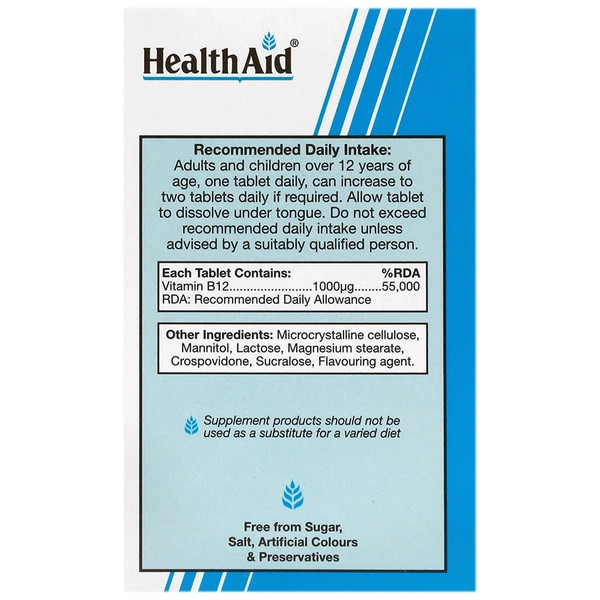ویتامین B12 هلث اید محصولی تحت برند کشور انگلستان است و با پروانه شرکت نیک اختر آریا در ایران تولید میشود. هر عدد قرص زیر زبانی B12 هلث اید حاوی 1000 میکروگرم ویتامین ب 12 به فرم سیانوکوبالامین است. این مکمل در ساخت گلبولهای قرمز خون و پیشگیری از کم خونی، حفظ عملکرد سیستم عصبی و بهبود عملکرد مغز و قلب و عروق نقش دارد. ویتامین B12 هلث اید به صورت 50 عددی در بسته بندی قوطی پلاستیکی درون جعبه مقوایی به بازار عرضه میگردد. مکمل ویتامین B12 هلث اید عاری از هر گونه قند، نمک، رنگ مصنوعی و نگهدارنده است.