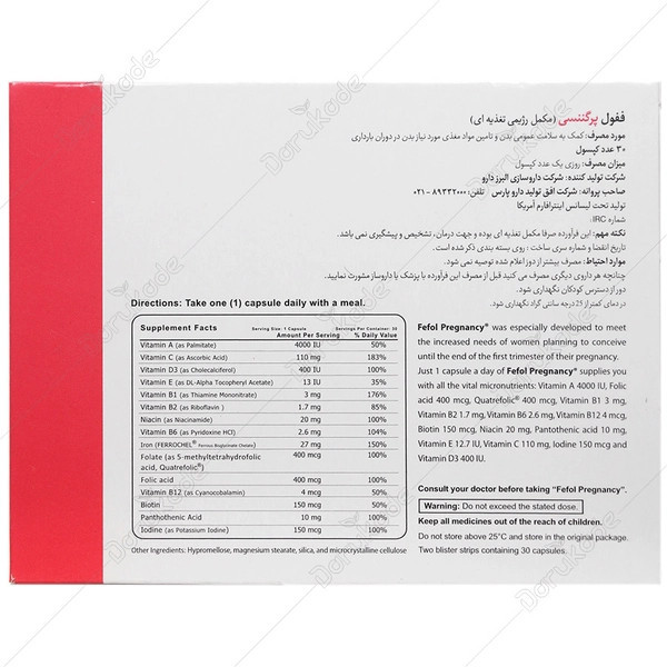 پیشنهاد شرکت سازنده مصرف روزانه 1 کپسول ففول پرگننسی است.