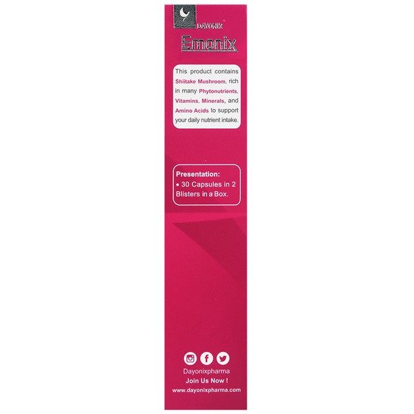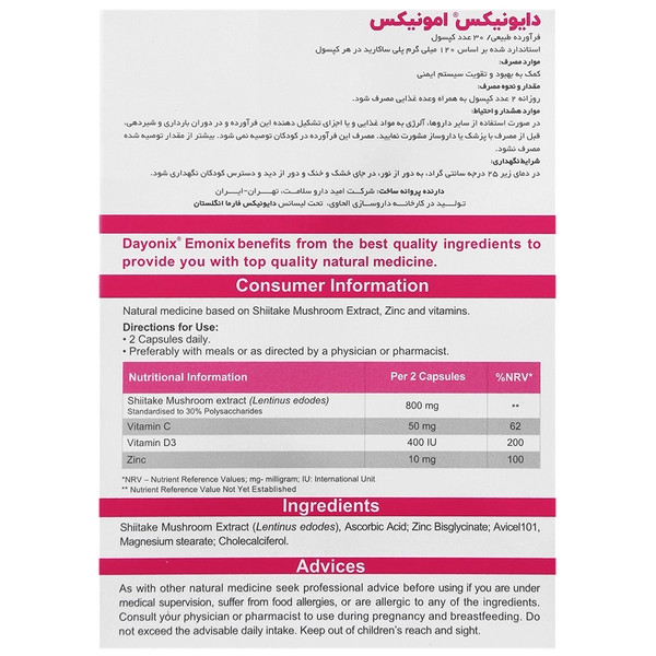 دایونیکس امونیکس محصولی از شرکت Dayonix Pharma انگلستان است که با پروانه ساخت شرکت امید دارو سلامت در بازار کشور راه پیدا کرده و با عصاره قارچ شیتاکه و سه ریزمغذی دیگر شامل ویتامین C ،D3 و زینک فرموله شده است تا در راستای سلامت و بهبود عملکرد سیستم ایمنی مورد استفاده قرار گیرد. امونیکس در جعبه های مقوایی ۳۰ عددی (۲ بلیستر با ۱۵ تایی) و به فرم دارویی کپسول طراحی شده اما در اصطلاح رایج به آن قرص دایونیکس امونیکس هم گفته می شود که برای سهولت خوانش به هر دو فرم آن اشاره خواهد شد.