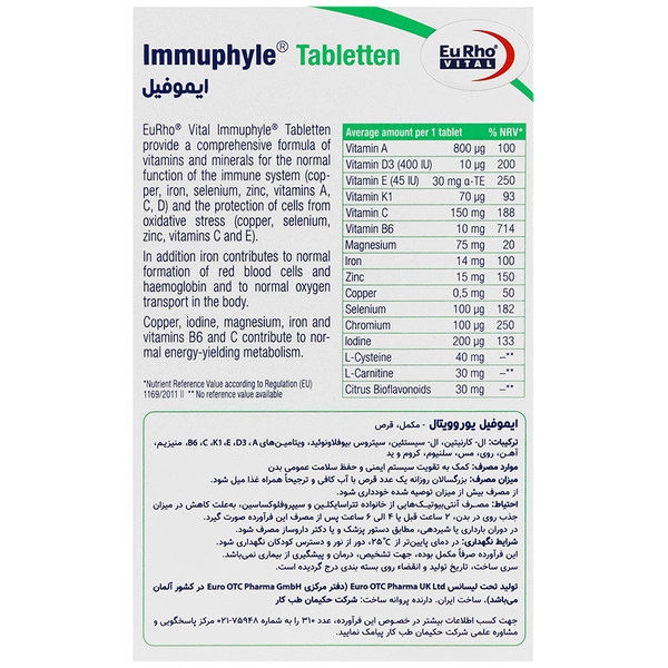 قرص ایموفیل یوروویتال یک مکمل تقویت ایمنی کامل است که با هدف پشتیبانی از عملکرد سیستم ایمنی و ارتقای سلامت عمومی تولید شده است. قرص ایموفیل یوروویتال ساخت شرکت حکیمان طب کار تحت برند Eurho Vital آلمان بوده و به صورت 4 بلیستر 15 عددی در جعبه مقوایی عرضه میشود. فرمولاسیون قرص ایموفیل ترکیبی از انواع ویتامینها، مواد معدنی و سایر ترکیبات موثر بر سیستم ایمنی است.