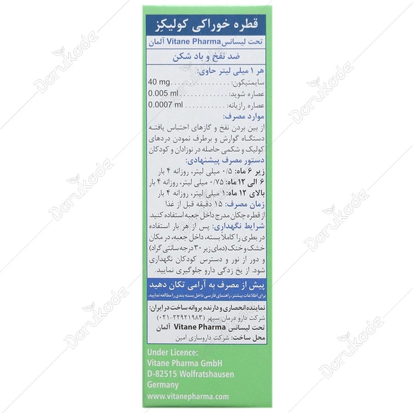 قطره کولیکز تحت برند ویتان در شرکت داروسازی امین تولید می شود. پروانه ساخت این محصول در ایران در انحصار شرکت دارو درمان سپهر می باشد.
