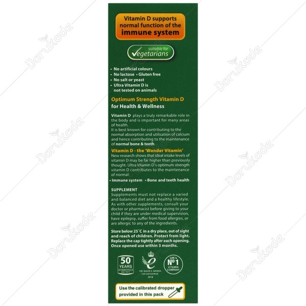 قطره اولترا ویتامین دی تحت لیسانس ویتابیوتیکس انگلستان در کارخانه داروسازی امین تولید می شود. این مکمل در هر بطری شیشه ای حاوی 30 میلی لیتر ویتامین دی به فرم کوله کلسیفرول می باشد. هر 1 میلی لیتر از این محصول حاوی 1000 واحد ویتامین دی به فرم کوله کلسیفرول است.